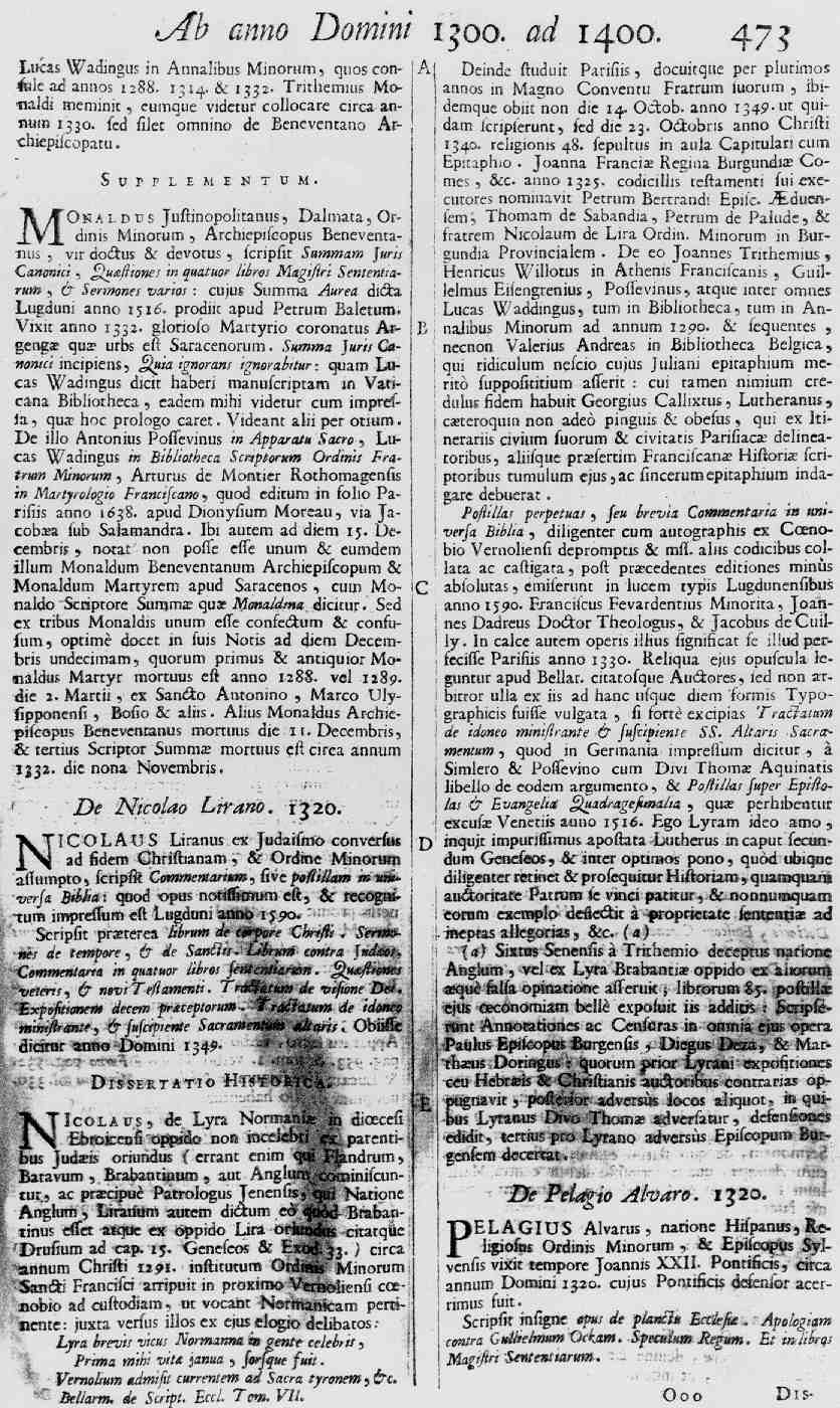In der Beschreibung des Lebens und Werkes des Nicolaus de Lyra im Werk von Bellarmin, De scriptoribus ecclesiasticis ist genau die Hälfte richtig: Nicolaus de Lyra war nicht jüdischer Abstammung, wie Bellarmin behauptet.